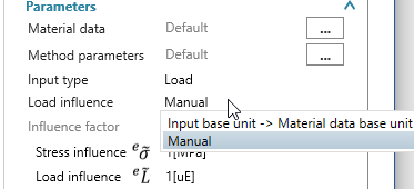 Figure 6: In the Strain Life Method of Simcenter Testlab Neo, if “Input Type” is “Load”, then “Load Influence” can be set to “Manual” or “Input base unit -> Material data base unit”.